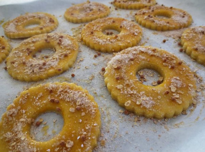 2. Рабочую поверхность присыпать мукой, из теста раскатать пласт толщиной примерно 8 мм. При помощи круглых формочек вырезать кольца. В центре каждого кольца, вырезать отверстие диаметром 2 см. Противень застелить пекарной бумагой и положить кольца, оставляя расстояние между ними. Противень положить в холодильник на 20 минут.
