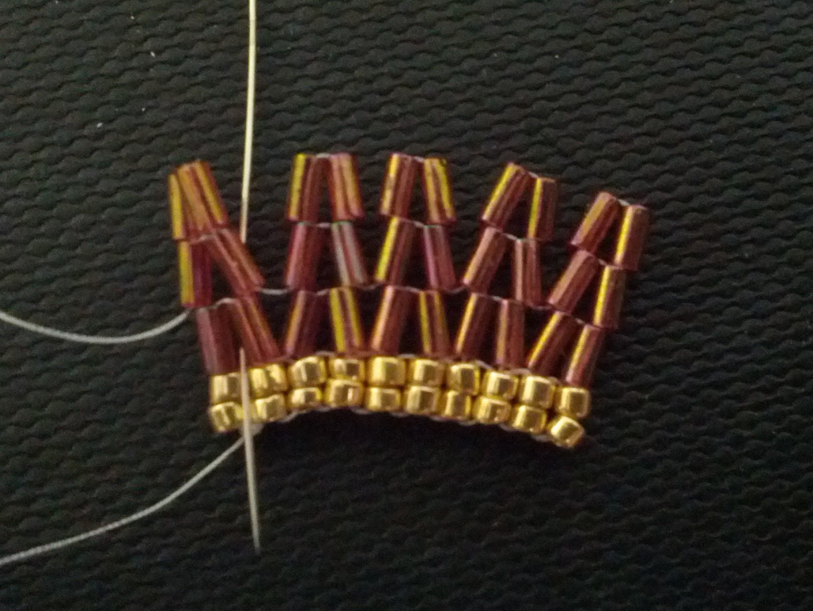 Мы собираемся сделать то же самое в этом ряду, как в последнем ряду, за исключением того, мы добавляем две семена между каждым стежком, а не только один. Подобрать две стеклярус, пройти через Горна, рядом с одним ваш поток на выходе, забрать два семена, идите по следующей Горна, и повторите.