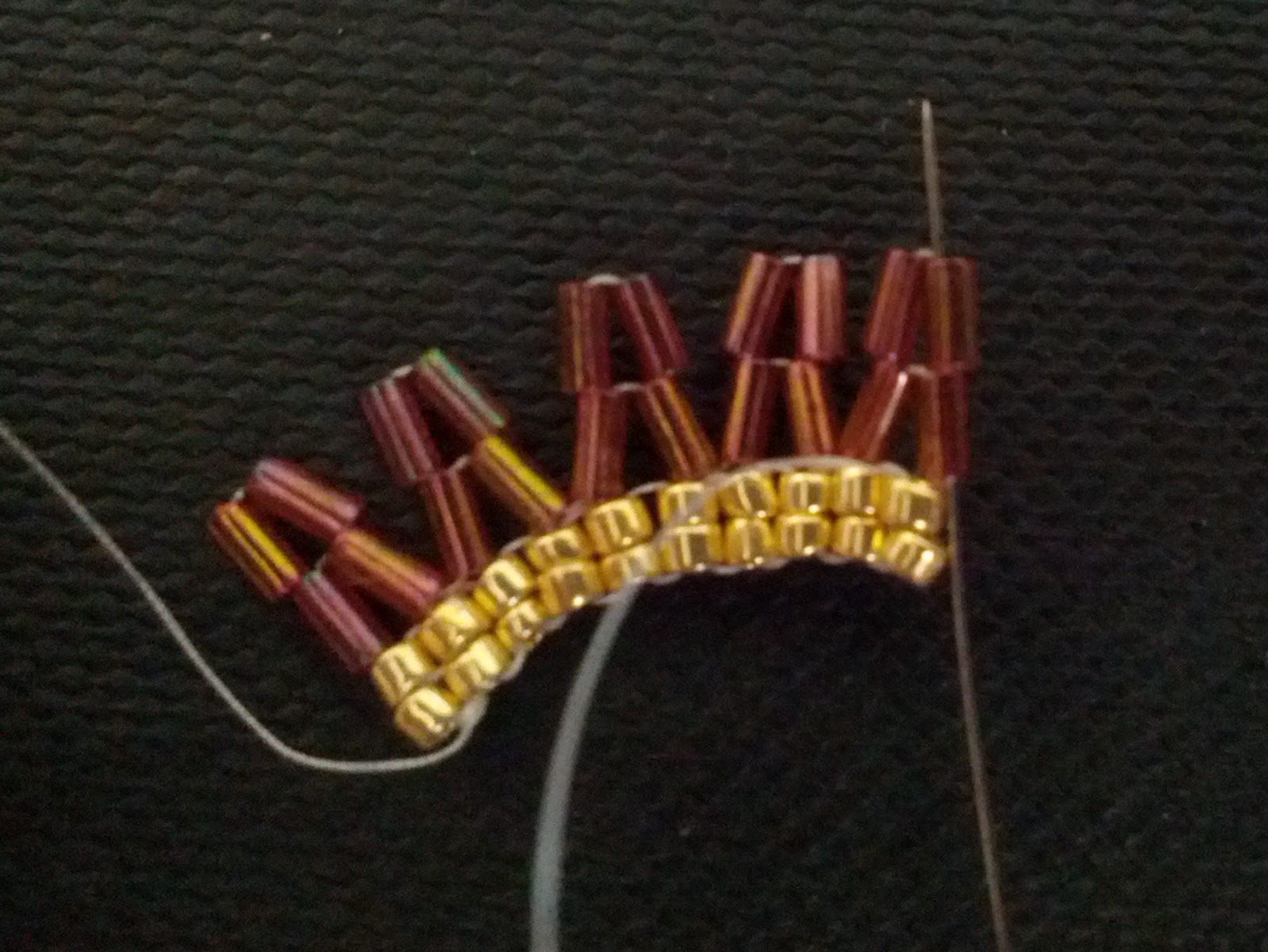 Этот ряд еще елочка, но с небольшим дополнением. Подобрать две стеклярусом и швом вниз через Горна, рядом с одним ваш поток на выходе, как показано на рисунке. НЕ пройти рядом с горном в линию, хотя.