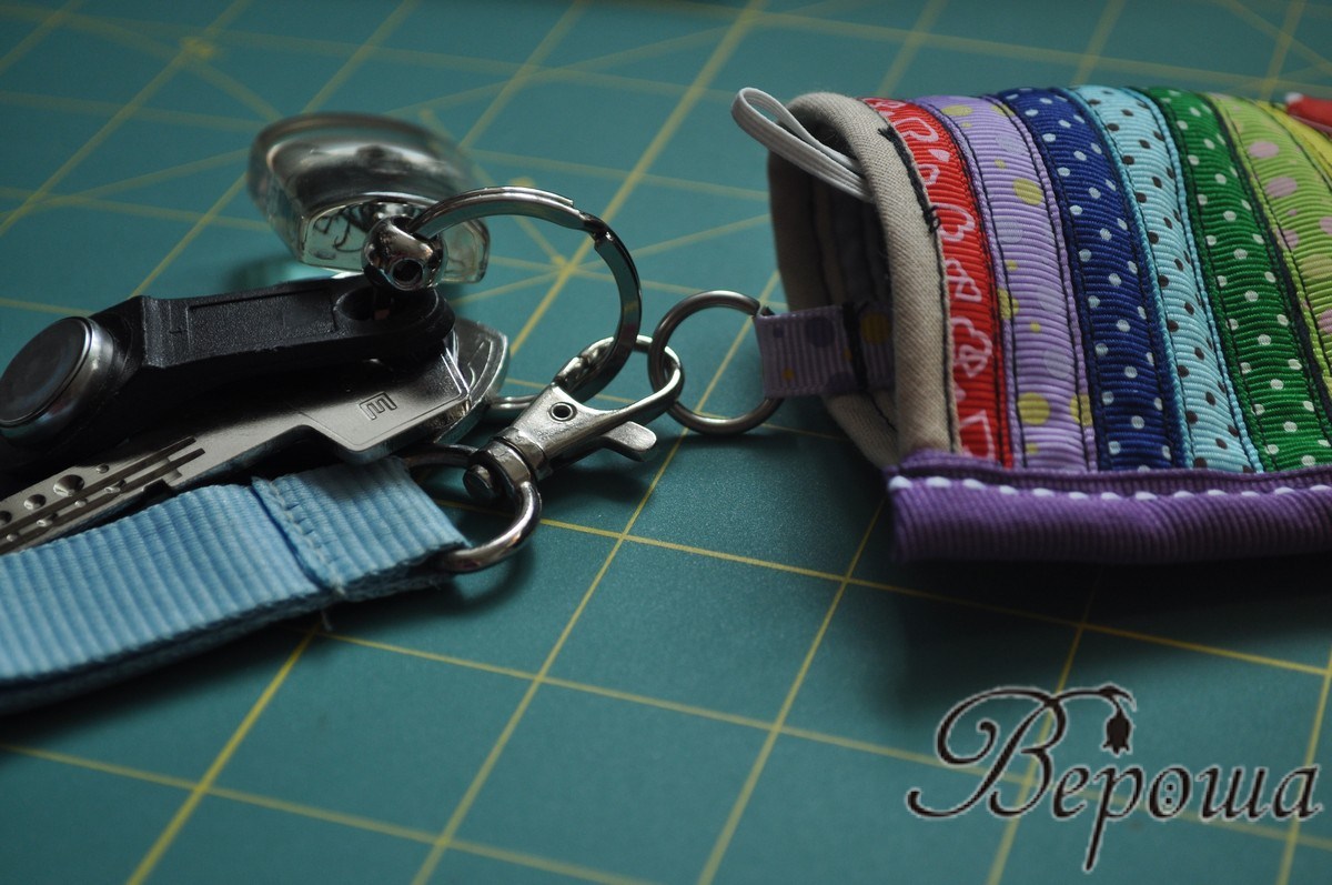 Такой чехол для ключей есть у моей мамы. Готовый. Из кожи. А идею с репсовыми лентами я подглядела на радужном конкурсе (поэтому эту работу не буду в него добавлять, а то как-то некрасиво получится). И в этом МК есть идея по использованию кромочек от тканей :) Люблю всему найти применение ;)