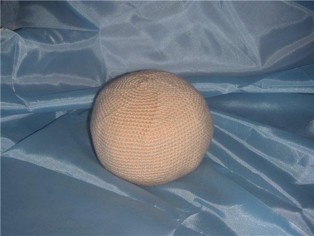 теперь берём самую большую иголку которую найдёте в доме ,вдеваем нить телесного цвета( (которой вязали малыша) . Вводим иголочку сначала снизу подбородка с одной стороны и протыкаем насквозь к тому месту, где будет начало глазика ,наша первая булавочка .Затем ,отступив 1,5-2 см (смотря какой будет глазик)вводим иголку в то место место где вторая булавочка и протыкаем обратно к подбородку и стягиваем -получается симпатичная щёчка у ребёночка.Так же нужно сделать и со вторым глазиком.
