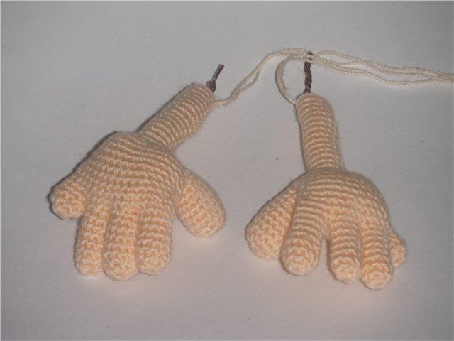 мизинец: 1 р. 2 в.п-6 сбн во вторую от крючка петлю 2 р. 6 пр= 12 сбн 3 р. (2,уб)- 3 раза = 9
