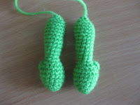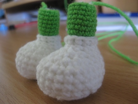 11) 3 сбн провязать вместе, 1 сбн (Меняем нить на зеленую и снова вяжем за задние стенки петель. Белой нити оставляем 30-35 см. для оформления бортиков у ботинок) вяжем пока весь ряд не станет зеленым. Т.о. начало ряда у нас сдвинулось на 3 петли вперед.
