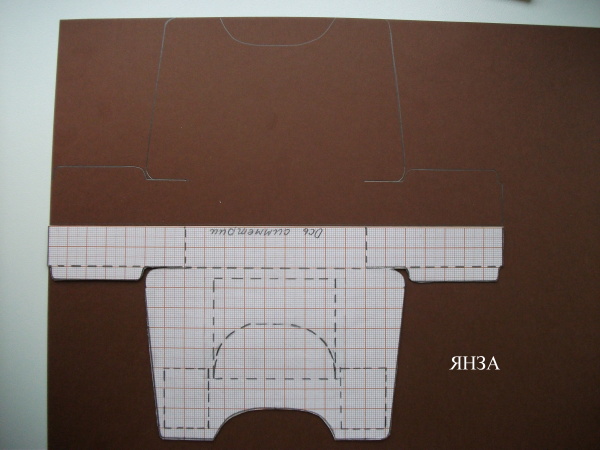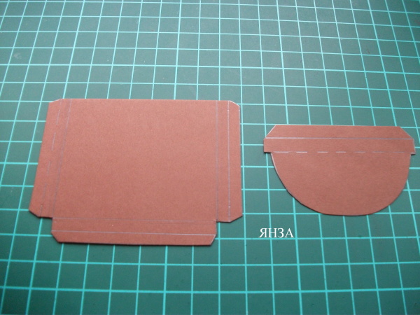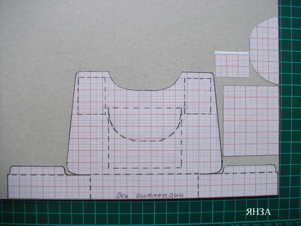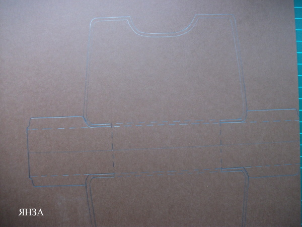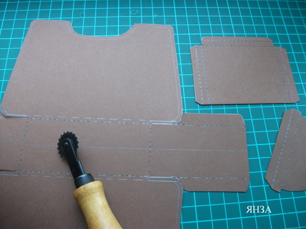 11. Вырезаем по линии внешнего контура всю заготовку основы. Затем рисуем прямоугольник кармана и с трёх сторон добавляем по 5+5мм для объёмного края кармашка. С одной длинной стороны ничего не добавляем. У клапана тоже добавим по прямой стороне 5+5мм. Это необходимо для придания кармашку объёмности. Получившиеся детали тоже вырезаем. С помощью инструмента с зубчиками делаем биговку линий сгиба(они на шаблоне пунктиром).