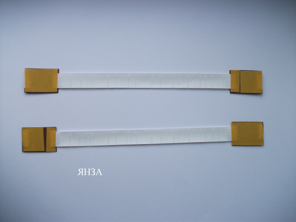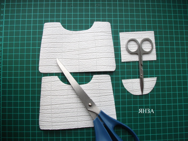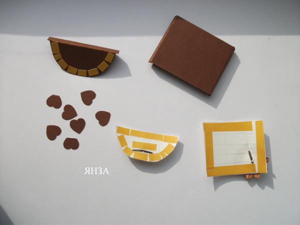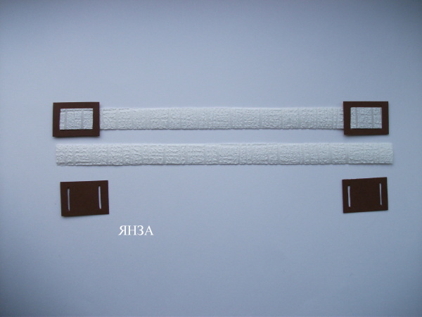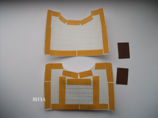20. К белым боковинкам с изнанки клеим скотч. Вырезаем 4 штуки коричневых прямоугольничка размером 22х30мм.