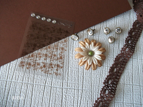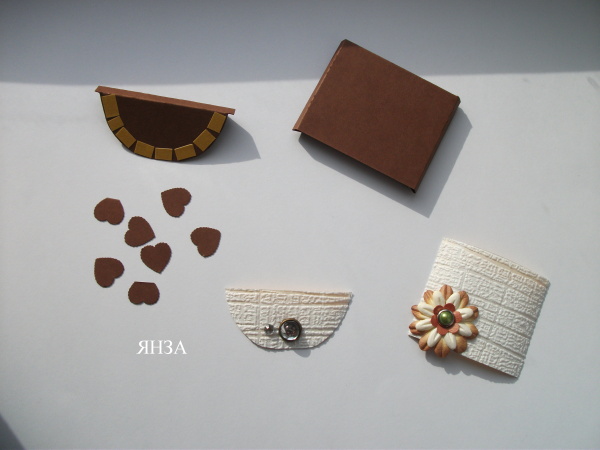 16. Для декорирования края клапана я хотела использовать кружево, но оно оказалось слишком толстым и грубым для маленькой заготовки. И я использовала коричневые дырокольные сердечки - листики, приклеив их на край зубчиками.