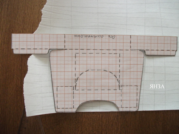 13. Теперь займёмся белой отделкой сумочки. Берём кусок обоев и переворачиваем вверх изнанкой. Полоски рисунка ставим горизонтально. Кладём шаблон и обводим карандашом.