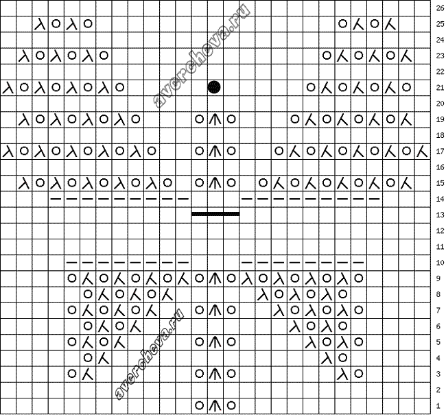 Раппорт узора 26 петель в ширину ( Кол-во петель в раппорте меняется). В высоту повторяем с 1-го по 24-й ряд.