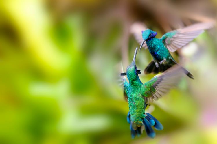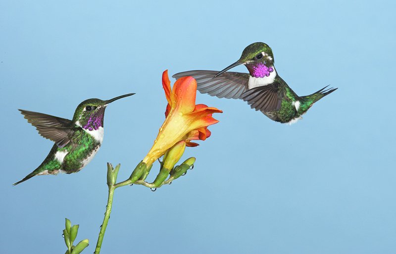 По этой причине оттенки некоторых участков тела могут преображаться в зависимости от точки наблюдения – стоит колибри повернуться в другую сторону, как ничем не примечательная зеленоватая окраска начинает пламенеть пурпурным огнем.