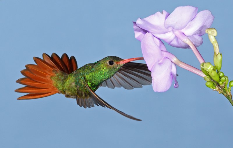 Колибри может близко подлетать к цветку, чтобы проникнуть в него, неподвижно зависать в воздухе пока она соберёт достаточно нектара, а затем отлетать назад от цветка, чтобы вытащить из него свой клювик.