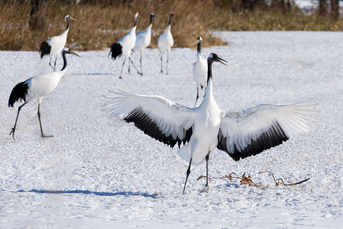 Окрас белых журавлей - преимущественно белый, крылья имеют черное окончание.