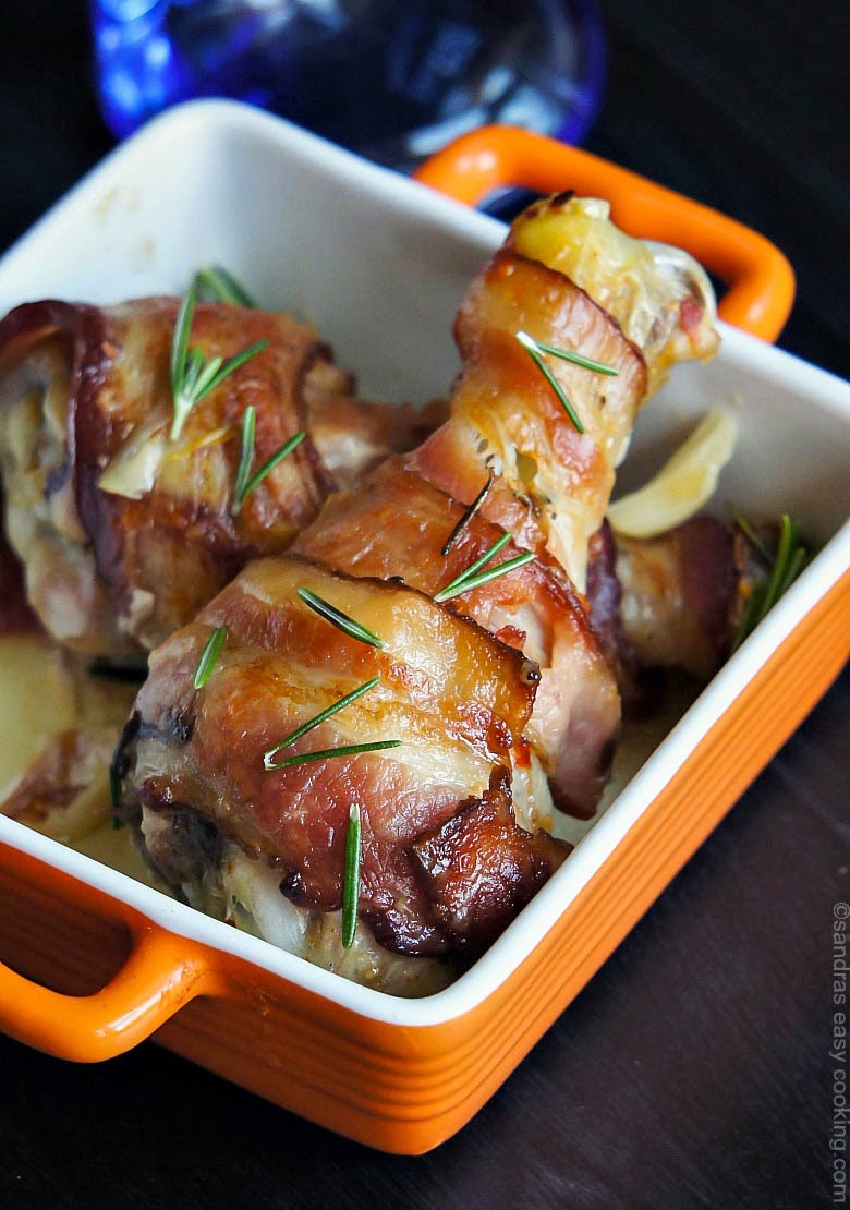 Скоро Новый Год! Для меня это очень значимое и радостное событие. Хочется, чтобы праздничная ночь запомнилась чем-то особенным. Не знаю, как вы, а я возлагаю на нее особенные ожидания. Вдруг что-то изменится к лучшему. Красивое платье, елка в игрушках, много гостей и непременно великолепный праздничный стол. Этому аспекту уделяет особое внимание, наверное, каждая хозяйка. Не обязательно покупать килограммы красной икры, севрюгу, перепелов и прочие деликатесы. Аппетитнейшие блюда можно приготовить из доступных ингредиентов. Главное - готовить с любовью. Вот простой новогодний рецепт - куриные ножки в беконе и красном вине.