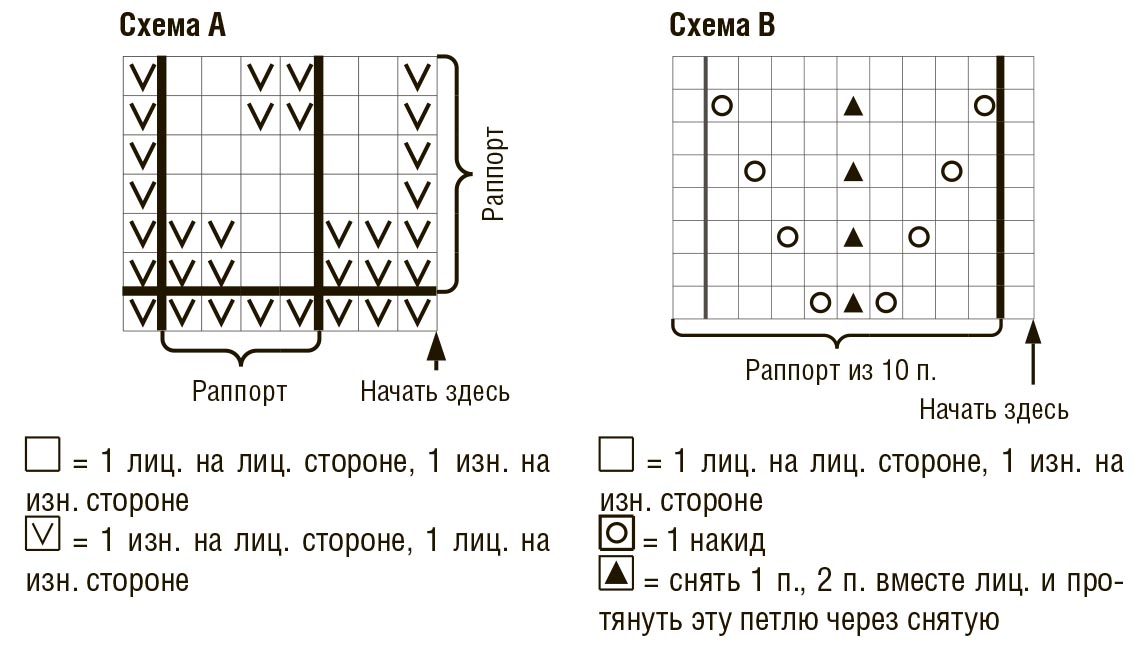 Далее вязать по схеме В, провязывая с обеих сторон по 1 кром., при этом в 1-м р. схемы прибавить/убавить петли так, чтобы на спицах стало 263 (263–273–293–323– 333) 343 п.