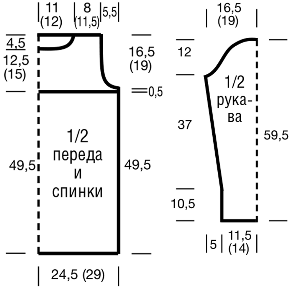 Вязать, как спинку, но через 12,5 см = 36 рядов (15 см = 44 ряда) от смены узора закрыть для горловины средние 15 (19) п. и обе стороны закончить раздельно.