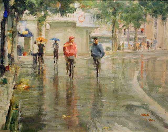 Но время шло, и отношение к велосипеду стало меняться. Карикатуры и насмешки сменило спокойное отношение, а затем и повальное увлечение. А потом и осознание пользы велосипеда. Взглянув уже спокойным взглядом (общественное мнение всегда давит на художника) на новый объект искусства, художники стали замечать прелесть и очарование простых сценок с "участием" велосипедов и, конечно, людей на них.