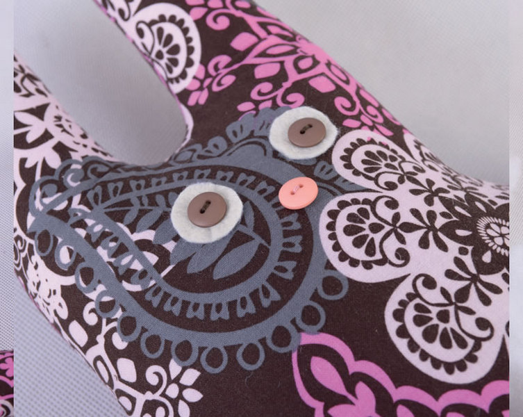 Обрежьте припуски близко к краю и аккуратно выверните заготовку на лицевую сторону. Набейте игрушку наполнителем, начиная с ушек и лапок. Зашейте потайным стежком отверстие для набивки. |