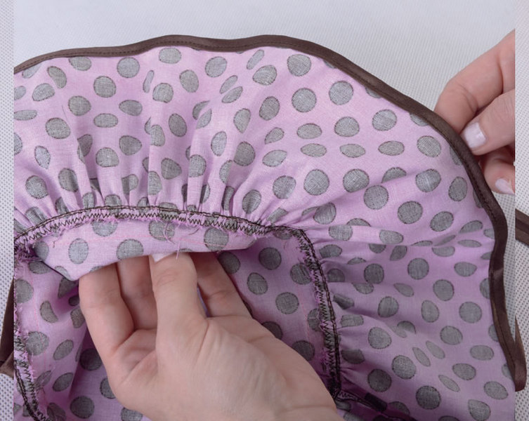 Сделайте на платьице пояс, для этого настрочите сверху косую бейку розового цвета. |