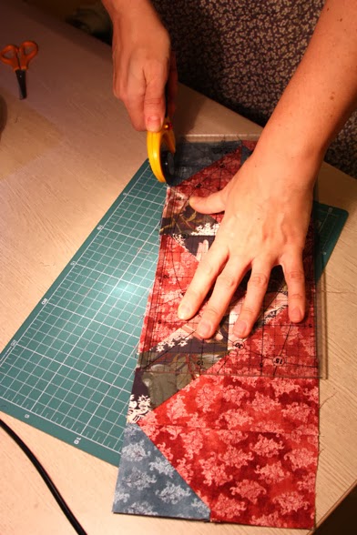 2. Сложите ткани стопкой друг на друга, лицевой стороной вверх, совмещая кайму. При помощи инструментов (мат, линейка, дисковый нож) обрежьте кайму, так как в лоскутном шитье кайма никогда не используется. Она создает лишнюю толщину.