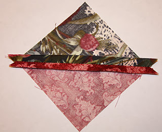 6. Далее из квадратов нужно сделать квадраты из 2 треугольников. Для этого нужно сложить 2 квадрата из двух разных тканей. Сколоть по углам и прочертить карандашом или маркером для ткани диагональ. Стачать справа и слева от диагонали на ширину лапки. Длина стежка - 2,0-2,2 мм.