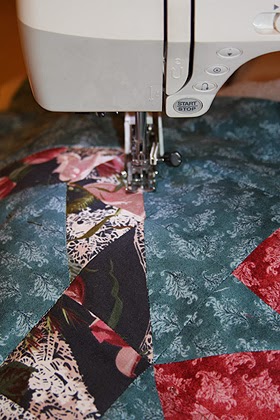 Стежка: Положите лоскут однотонной светлой х/б ткани изнаночной стороной вверх, на нее - синтепон, сверху - готовое лоскутное полотно лицевой стороной вверх. Синтепон и ткань-подкладка должны быть на 2 см больше по всем сторонам, так как при стежке ткань дает усадку. Сколите булавками, начиная от центра полотна. На швейную машинку поставьте верхний транспортер. Это устройство позволит даже при рыхлом синтепоне стегать аккуратно и красиво. Длина стежка 2,8-3 мм.