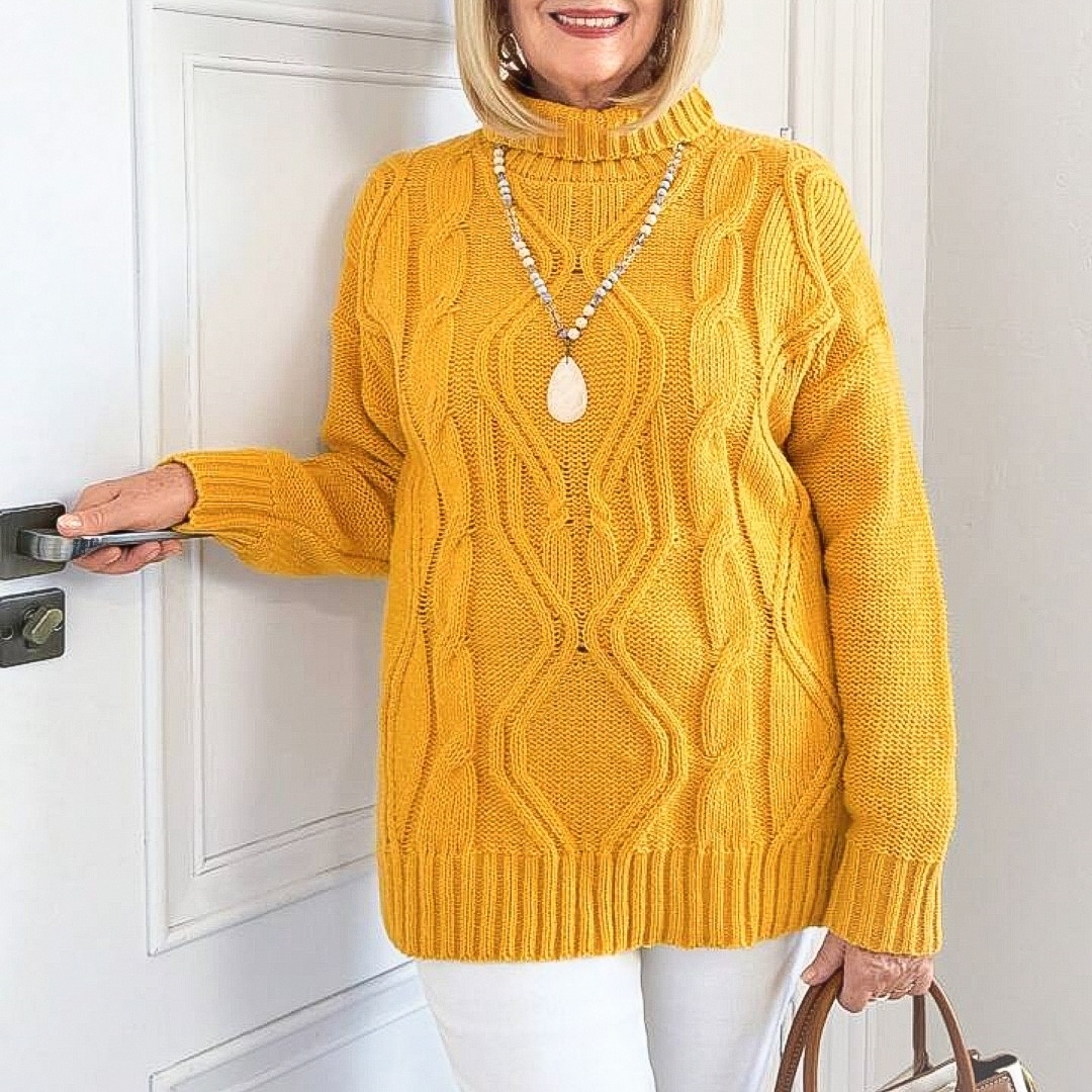 Эта модель — настоящее солнышко среди всех новинок! Ярко-жёлтый цвет моментально привлекает внимание и поднимает настроение. Но не только цвет делает этот свитер особенным: рельефные узоры, которые здесь используются, создают нарядный вид.