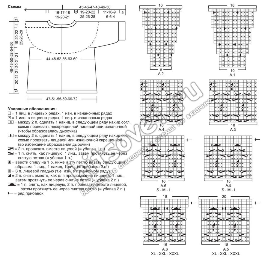 Узоры: вязать по схемам А.1 – А.6. Выбрать схему для требуемого размера (относится к А.5 и А.6). На схемах приведены все лицевые и изнаночные ряды, лицевые ряды читать справа налево, изнаночные ряды – слева направо.