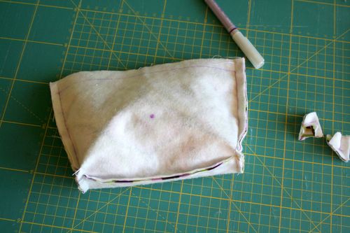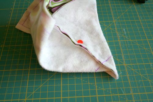 Чтобы сделать дно клатча расправляем угол сумочки, соединяем швы и закрепляем булавкой. От угла отмеряем 2 см., проводим линию перпендикулярно шву и по ней прострачиваем. То же самое повторяем со вторым углом. Уголки обрезаем.