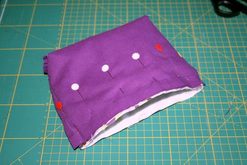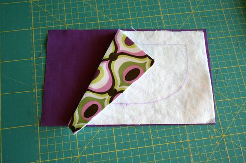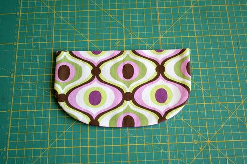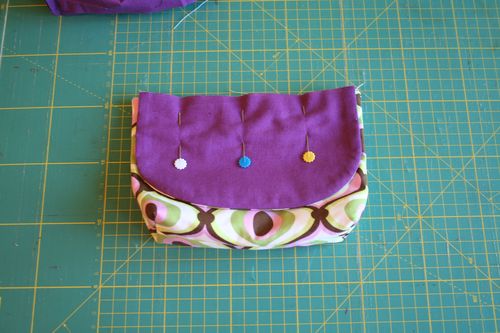 К внешней части клатча лицевой стороной внутрь прикалываем полукруглую часть и фиксируем булавками.
