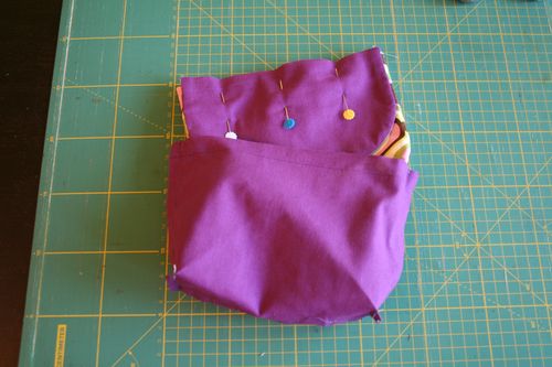 Всю эту конструкцию вкладываем в вывернутую наизнанку подкладку, фиксируем по кругу и прострачиваем.