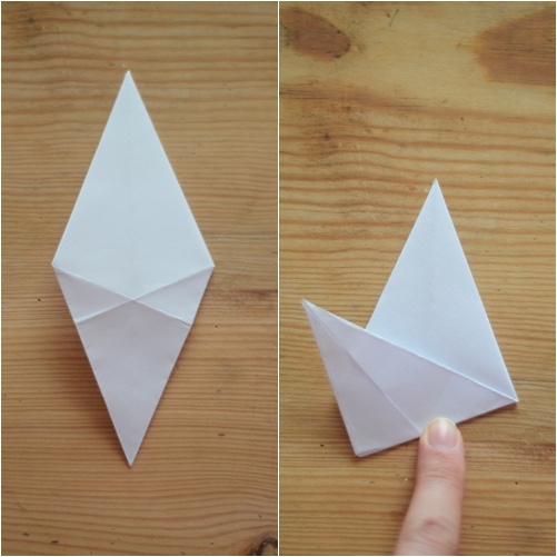 2. Ta tak i den nederste spissen, og brett den mot venstre, i den bretten som du laga før du snudde figuren.