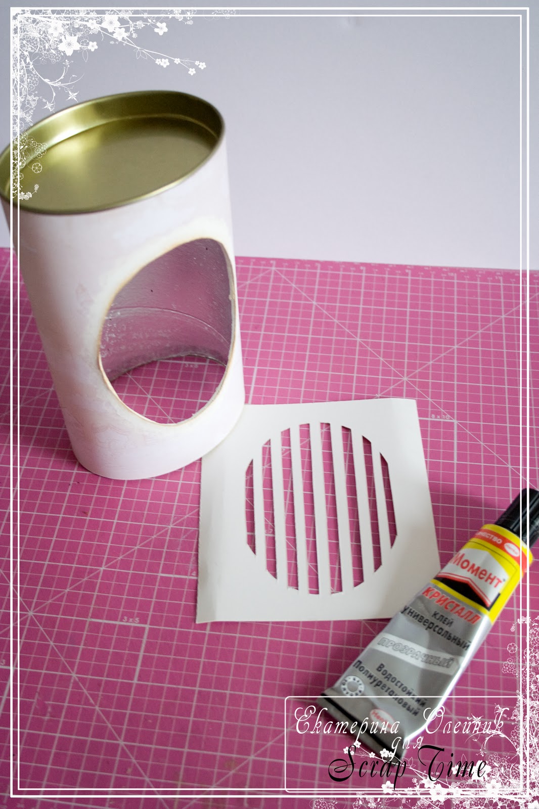 9. Теперь наше "окошко в решетку" мы слегка выгибаем. И с помощью клея приклеиваем внутрь банки, закрывая наш вырез.