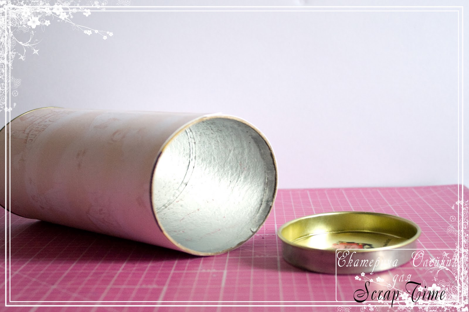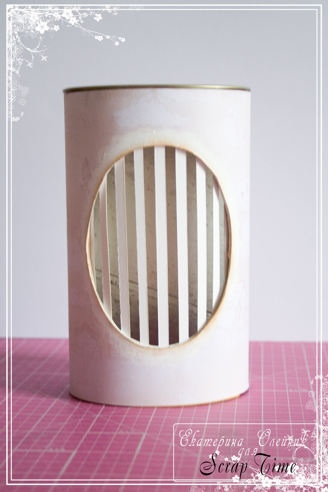 1. Из листа скрап бумаги вырезаем прямоугольник по ширине банки (в моем случае это 15 см) и обклеиваем ей банку.