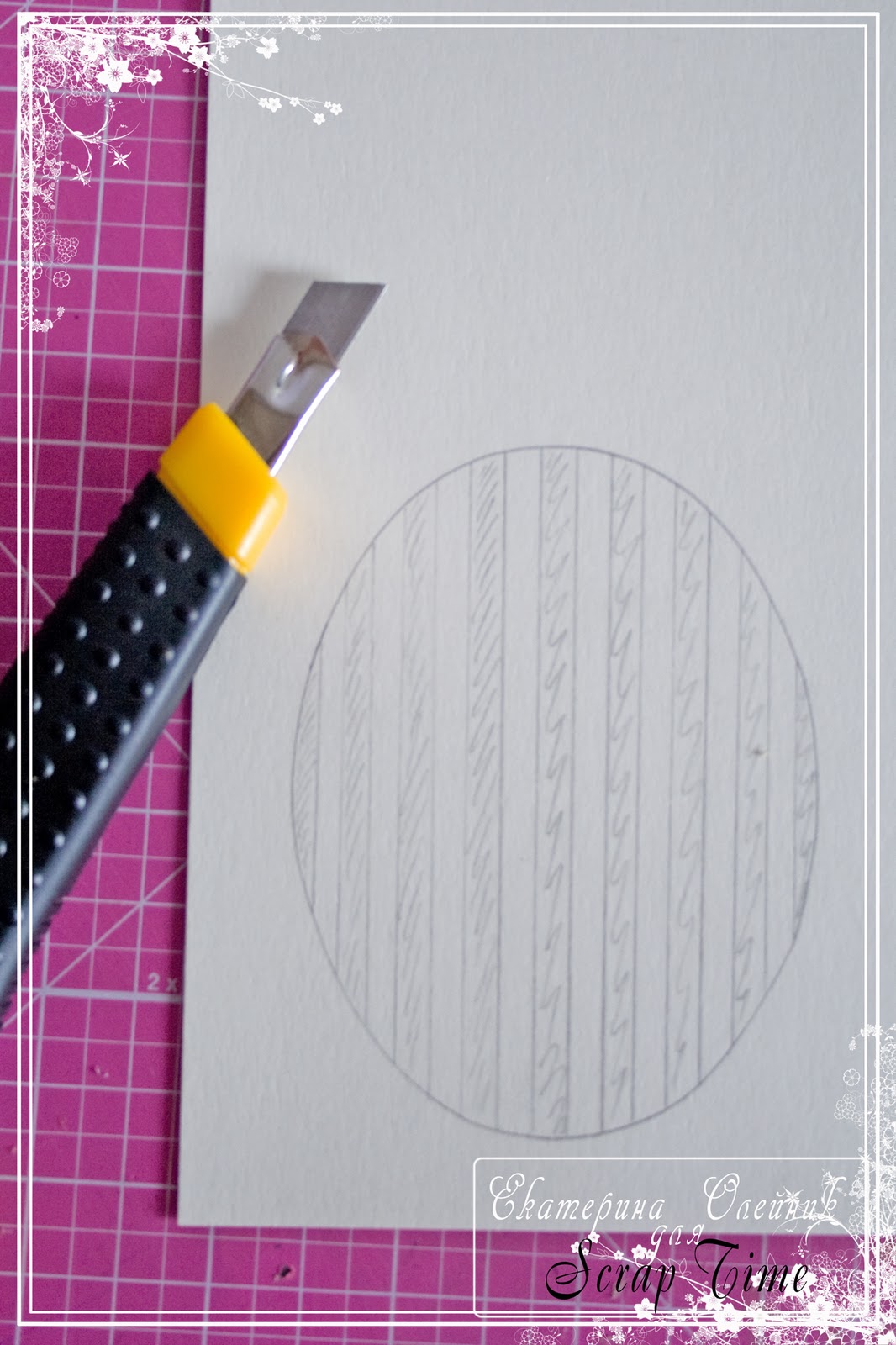 8. На не сильно плотный картон накладываем нашу заготовку-овал. Обводим карандашом. Рисуем полоски и заштриховываем те полоски, которые в конечном результате должны остаться видны.