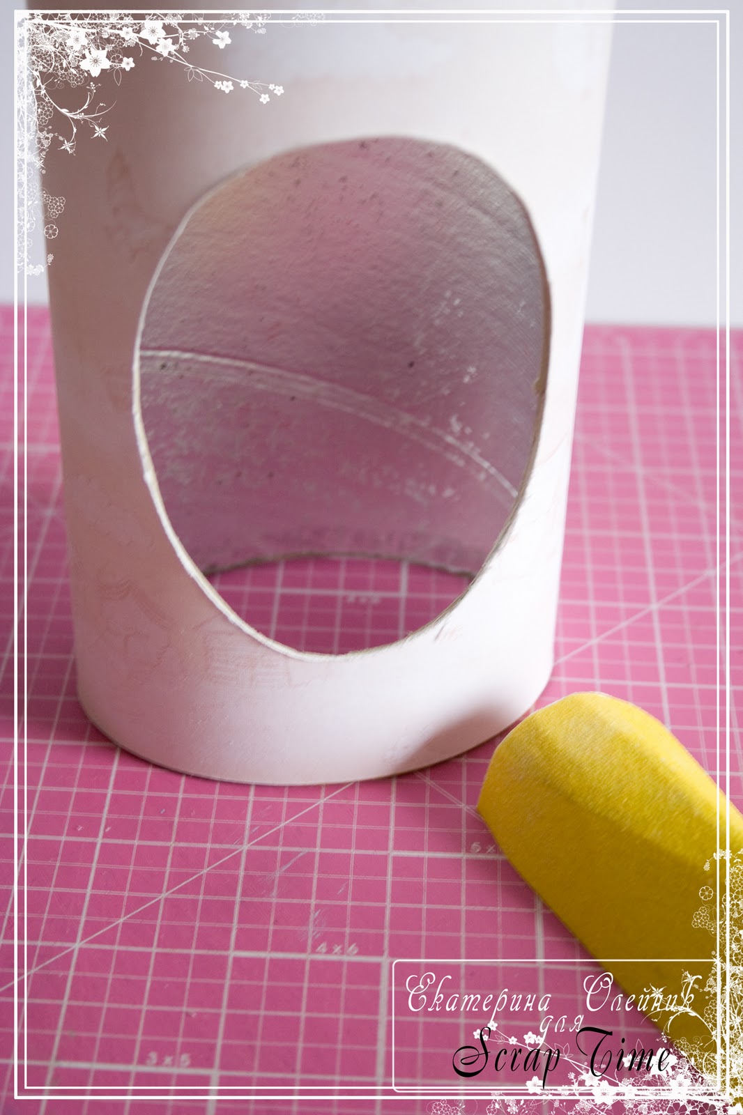 5. Теперь аккуратно канцелярским ножом вырезаем наше окошко. Лучше всего это делать в три этапа. Сначала мы, несильно нажимая на нож, проводим по контуру. Так мы оставляем "борозду". На втором этапе мы нажимаем более сильнее ( здесь должна у вас "отпасть" овал скрап бумаги и этикетка). На третем этапе мы нажимаем сильно, и прорезаем сам картон коробки.