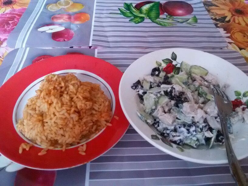 Рис пропареный промыть выложить в сковороду залить водой приправить специями посолить и на огонь до готовности.Салат.вареная куриная грудка без кожи,5 черносливин и свежий огурчик заправила 1 ч.л йогурта натурального.