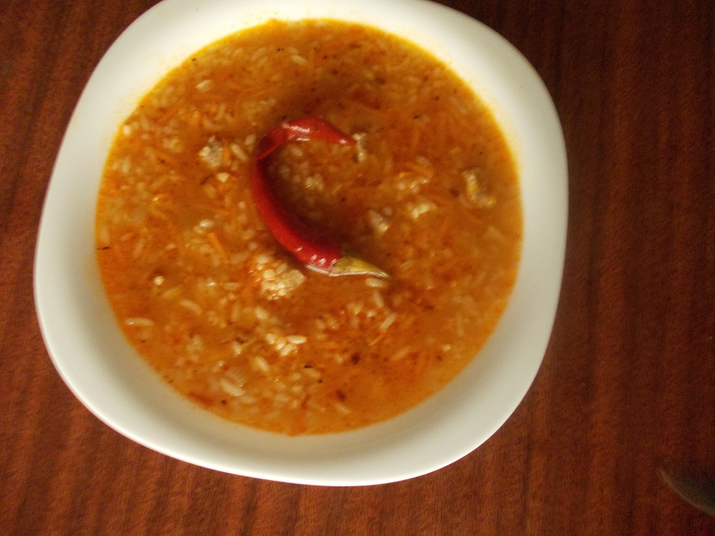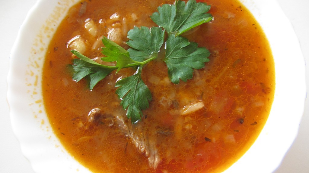 Сварить бульон из говяжьей косточки (400-500гр), 1головку лука порезать кубиками, с 2 помидоров снять кожицу, порезать кубиками. Лук потушить с помидорами, добавить специи (хмели-сунели), 1 стакан (160г) пропаренного риса и еще потушить минут 20. Мясо достать, в бульон добавить обжарку и варить до готовности риса. За пять минут до готовности добавить мясо, я обычно не режу, а разбираю по волокнам. При подаче украсить зеленью.