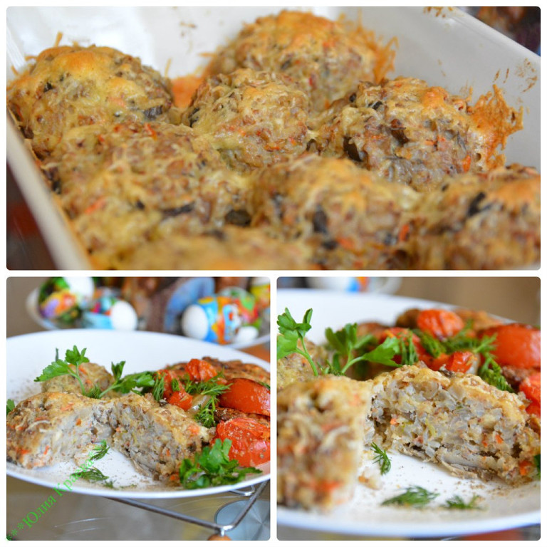 1,5 ст . гречки сварить(лучше в мультиварке) чтобы она была "сухая" и рассыпчатая, лук- репку порезать мелко, морковь -соломкой , спассеровать на 2 ч. л. раст . масла , грибы свежие ( у меня вешенки грамм 200-300) помыть , порезать мелкими кусочками - добавить в сковороду с луком и морковью довести под крышкой до готовности, соль, перец , я еще добавила хлопья острого красного перца. 50 гр сыра потереть на терке , одну часть добавить к остывшим грибам с луком , туда же 2 яйца , и гречку - тщательно перемешать , мокрыми руками формировать тефтельки и выкладывать в форму для запекания , посыпать второй половиной сыра и отправить в разогретую духовку минут на 15-20, при 180 гр.