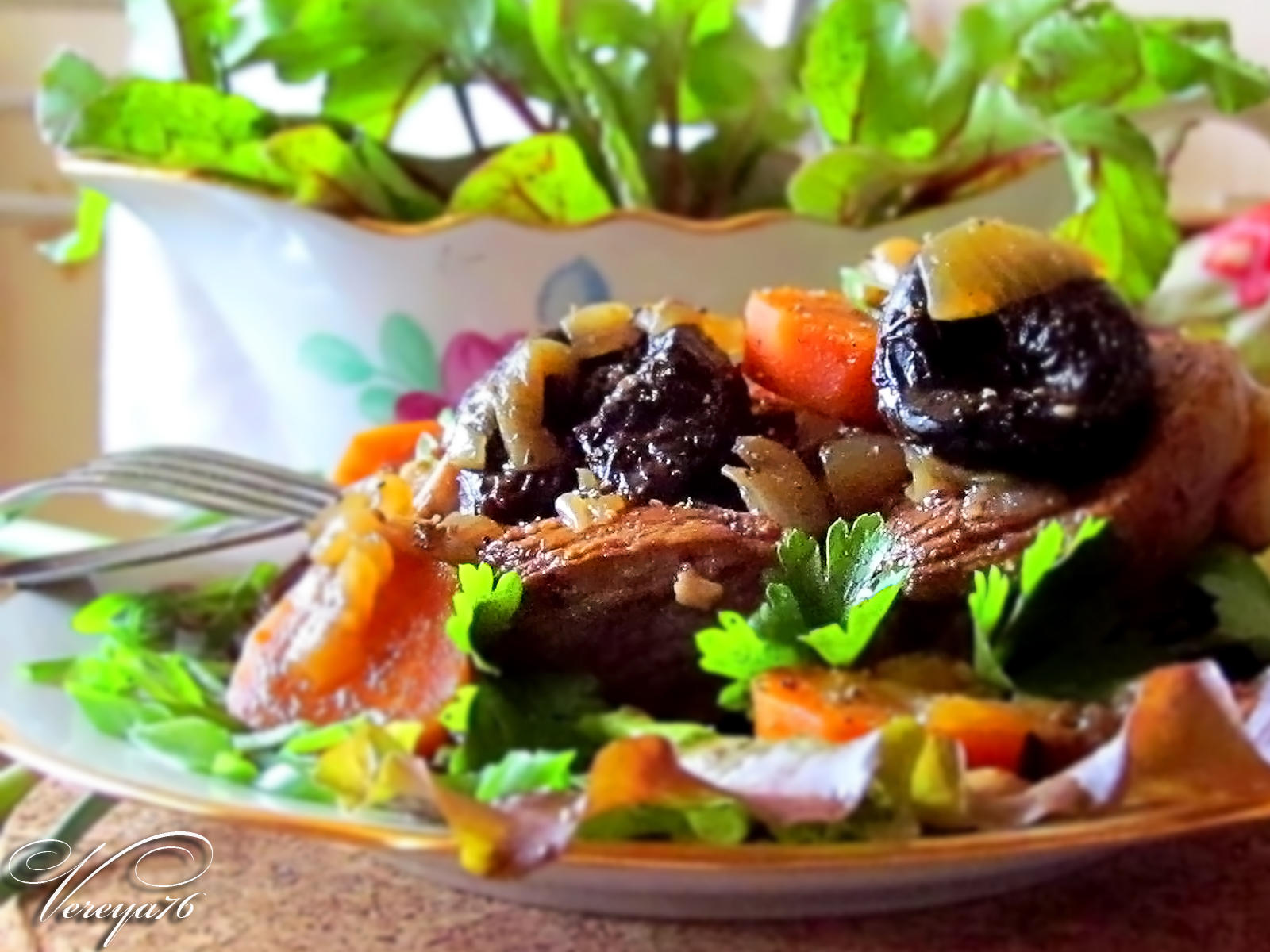 Посолить, добавить специи, чернослив, примерно 2 мультистакана воды. Режим "тушение" 1 час.