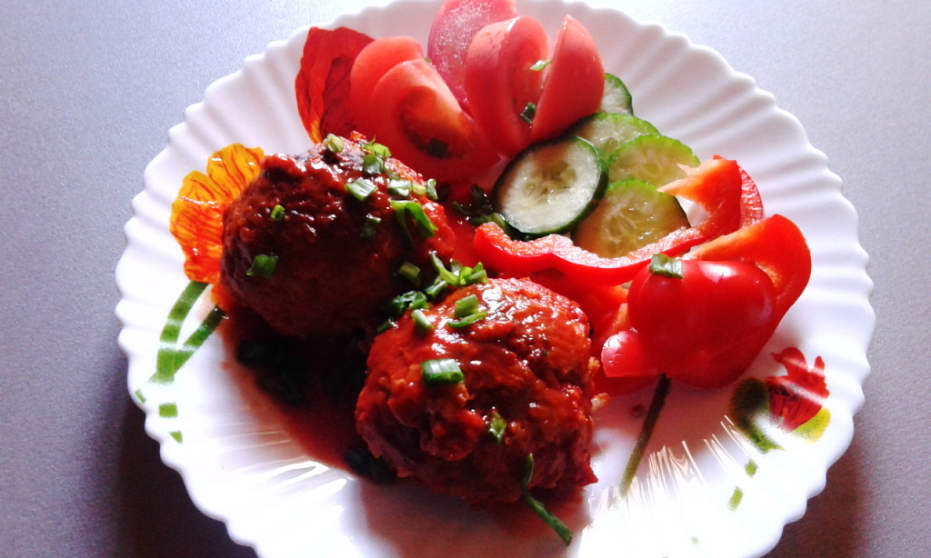 Пол килограмма фарша из нежирной свинины,пол стакана пропаренного риса (замачивала на ночь), 1 яйцо. Соль,перец по вкусу.Формируем тефтели,укладываем на противень,заливаем томатным соком (без всяких добавок) и в духовку.На гарнир свежие овощи.