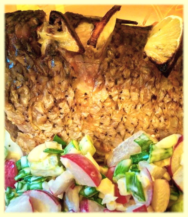 Карпа беру небольшого, на один раз. Отрезаю голову и хвост – как раз помещается в аэрогриль. Солю, перчу, разрезаю хребет, туда кладу дольки лимона, а саму рыбу сбрызгиваю лимонным соком. Заворачиваю в фольгу. Запекаю 40 мин при t 200 , потом открываю фольгу и 10 мин при t 230. Сегодня на гарнир салат из редиски, зеленого лука, чеснока и чайной ложки натурального йогурта 1,85% жирности.