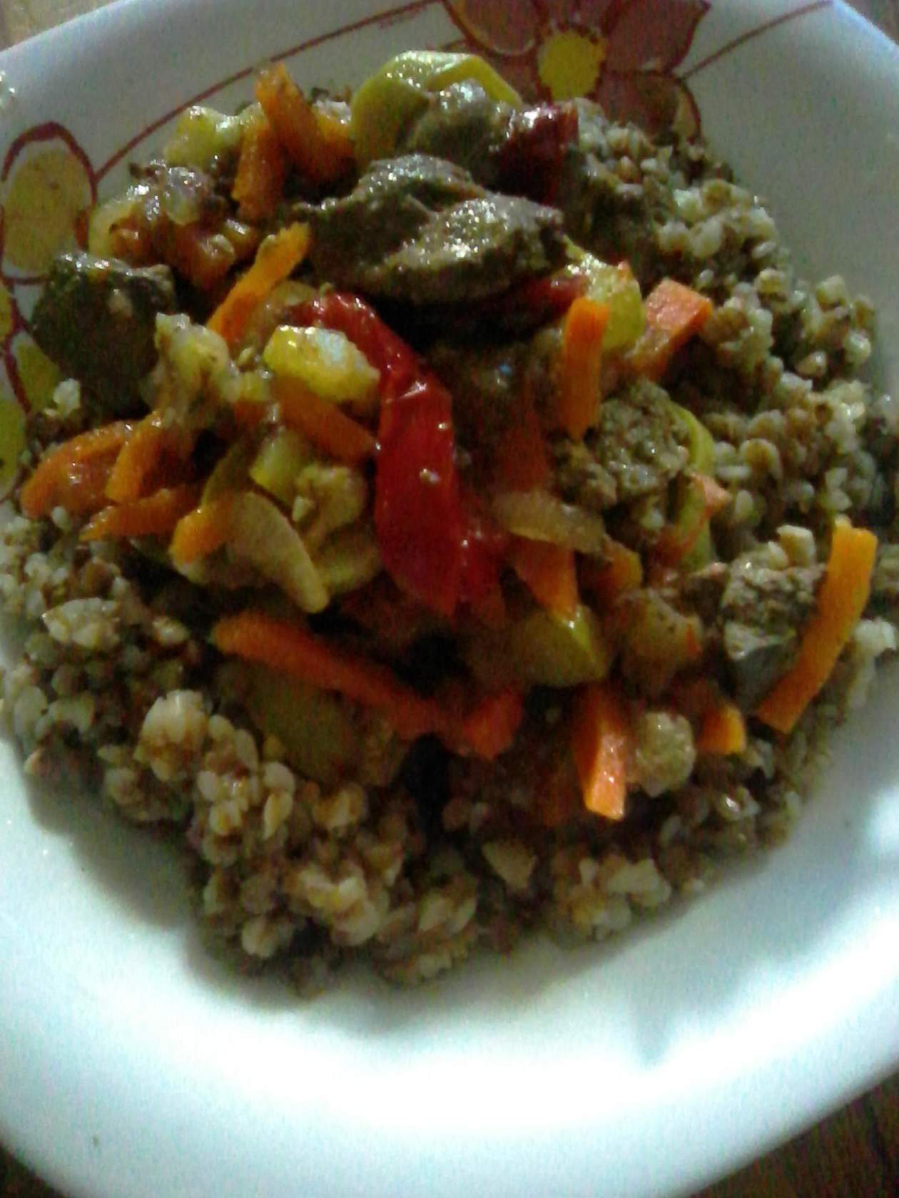 Печенка куриная тушоная с овощами. Лук, марковь, болгарский перец, острый перчик, кабачки. И с гречкой. Печень моем, очищаем от прожилок. Кладем на сухую сковороду и обжариваем 1-2 минуты. Добавляем овощи и обжариваем еще 5 минут. Затем вливаем воду, солим,перчим, убавляем огонь и тушим под крышкой 20 минут. Гречку сварить (масло не добавлять!)