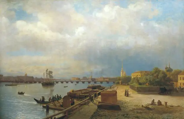 Вид на Неву и Петропавловскую набережную с домиком Петра I, 1859. Лев Лагорио