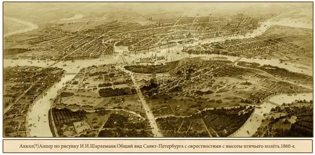 А. Аппер по рисунку И.И. Шарлеманя. Общий вид Санкт-Петербурга с окрестностями с высоты птичьего полёта. 1860-ые гг.