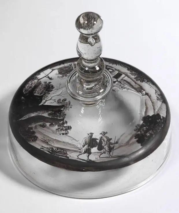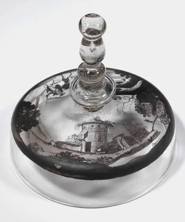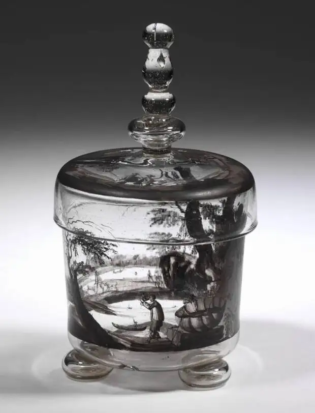 Стакан с крышкой, декорирован росписью шварцлотом. Художник: Иоганн Шапер. Нюрнберг, 1668 г.