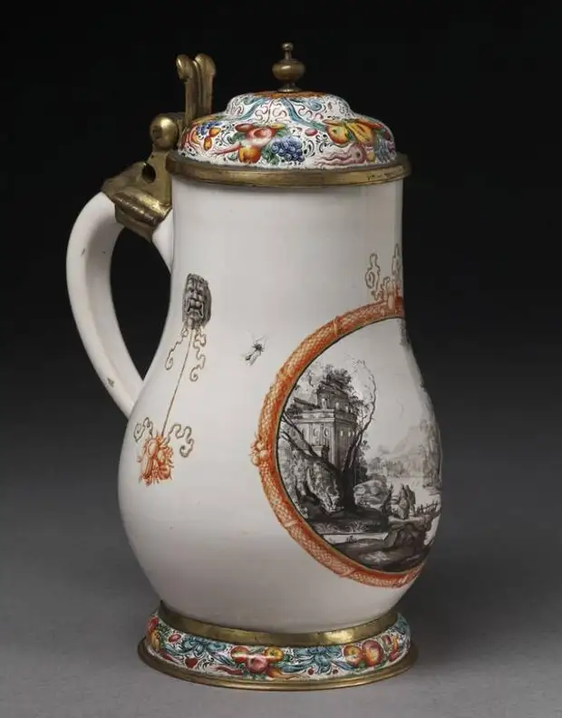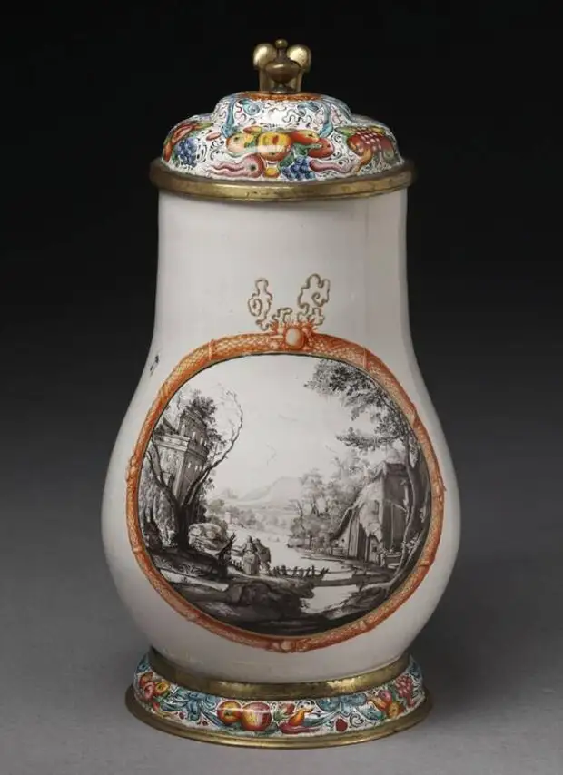 Кружка с крышкой, украшенная росписью шварцлотом. Фаянс, свинцовая глазурь, металл с позолотой. Высота – 22,2 см. Художник: Иоганн Шапер. Нюрнберг, ок. 1663 г.
