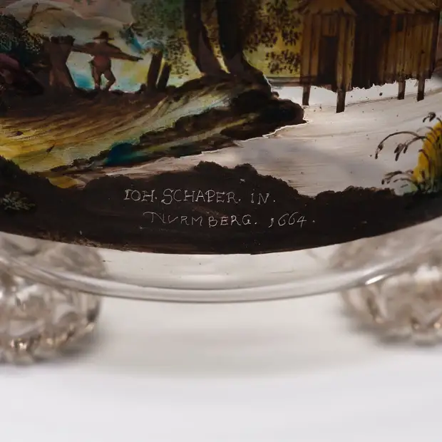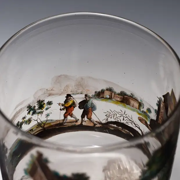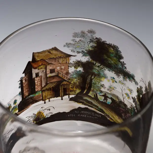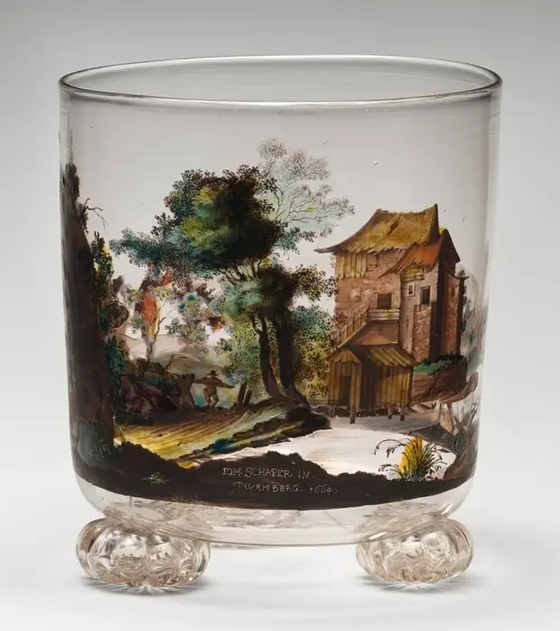 Стакан из расписного стекла. 10,2 × 8,7 см. Работа Иоганна Шапера — немецкого художника по стеклу и фаянсу. Он был настолько известен, что его техника получила имя — «шаперовские стёкла».