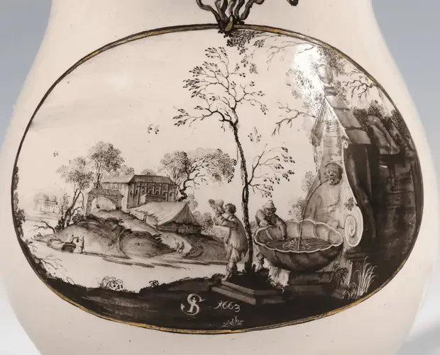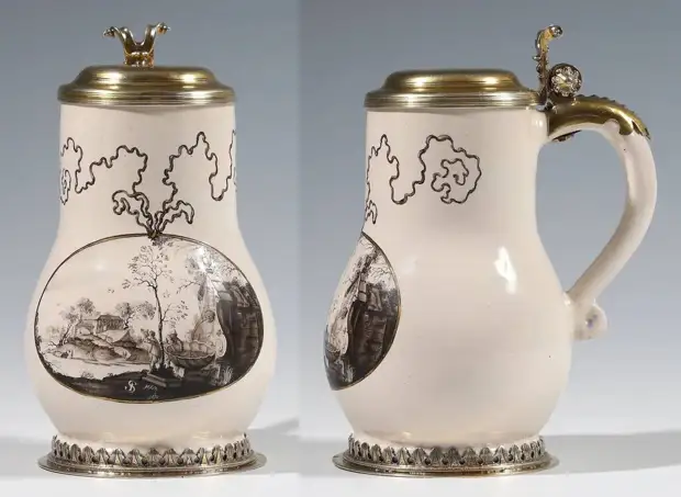 Кружка с крышкой, украшенная росписью шварцлотом. Фаянс, серебро с позолотой. Высота – 18 см. Художник: Иоганн Шапер. Нюрнберг, 1663 г.
