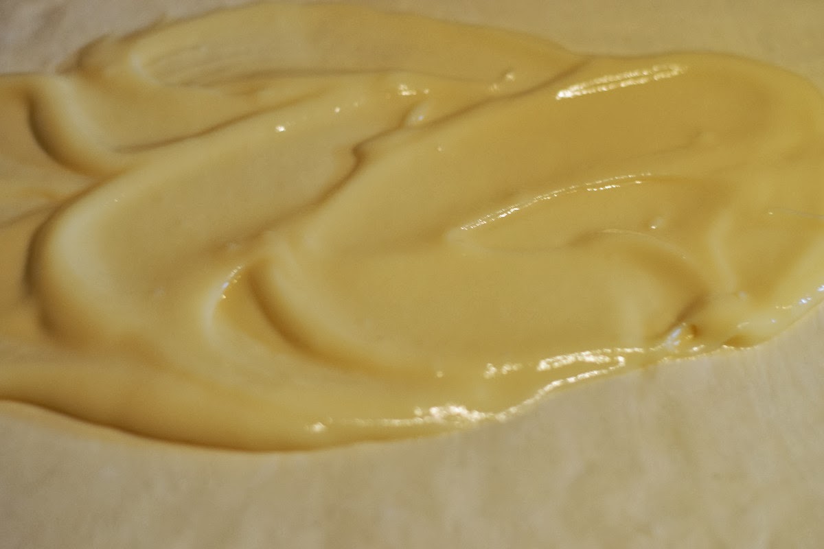 Готовое слоеное тесто на присыпанной мукой рабочей поверхности раскатываем в прямоугольник .