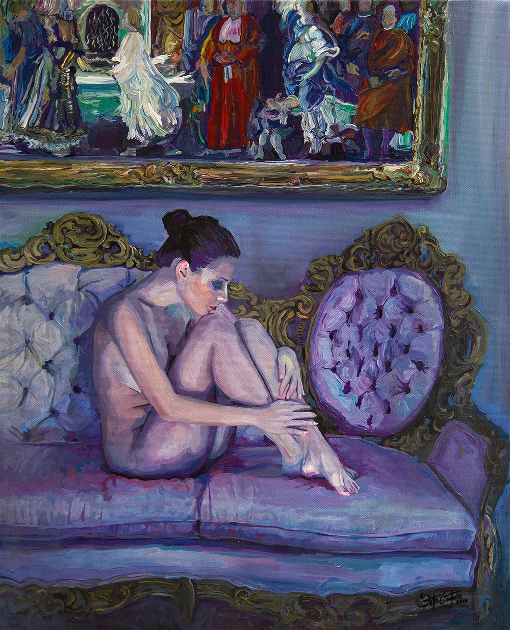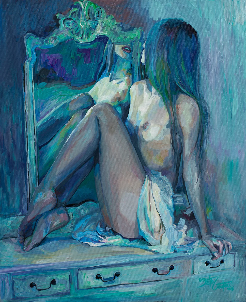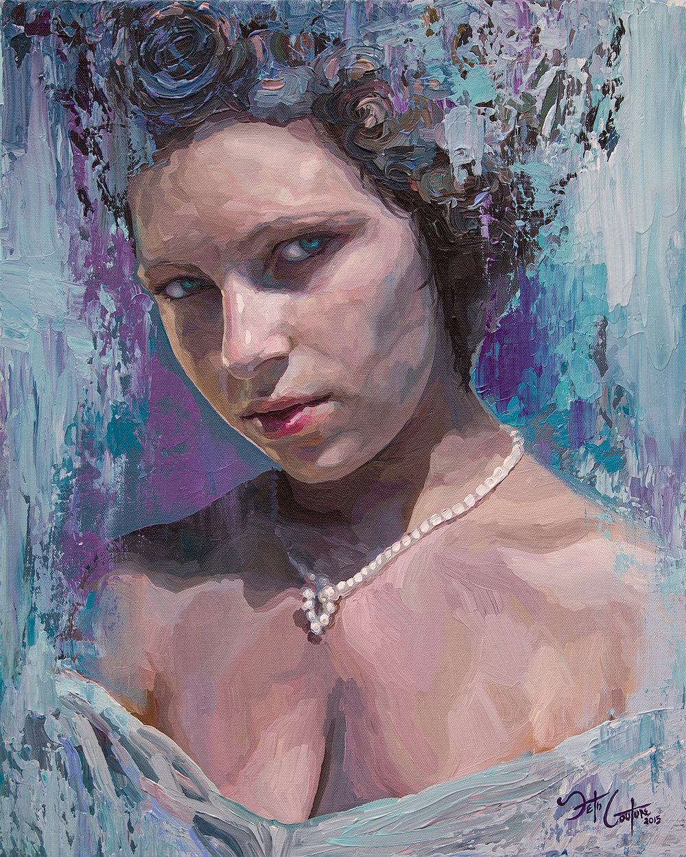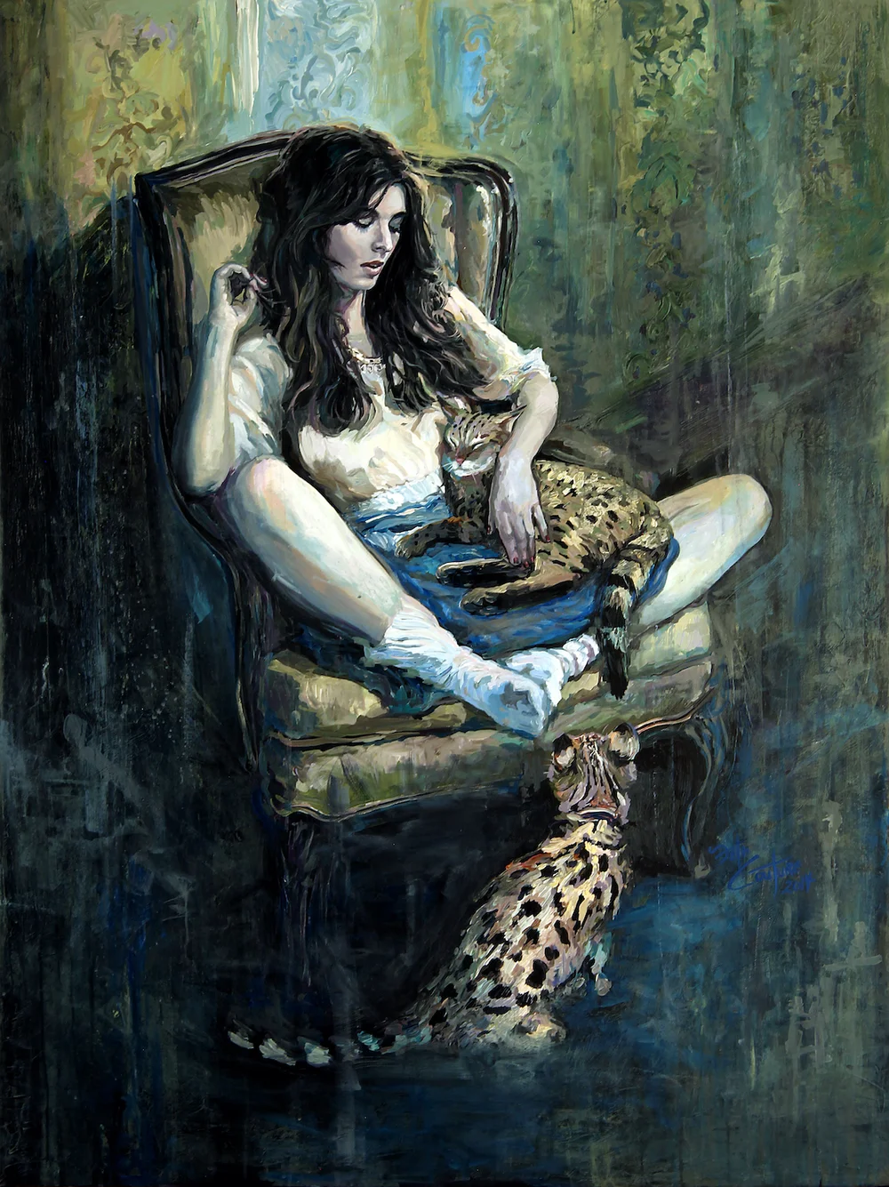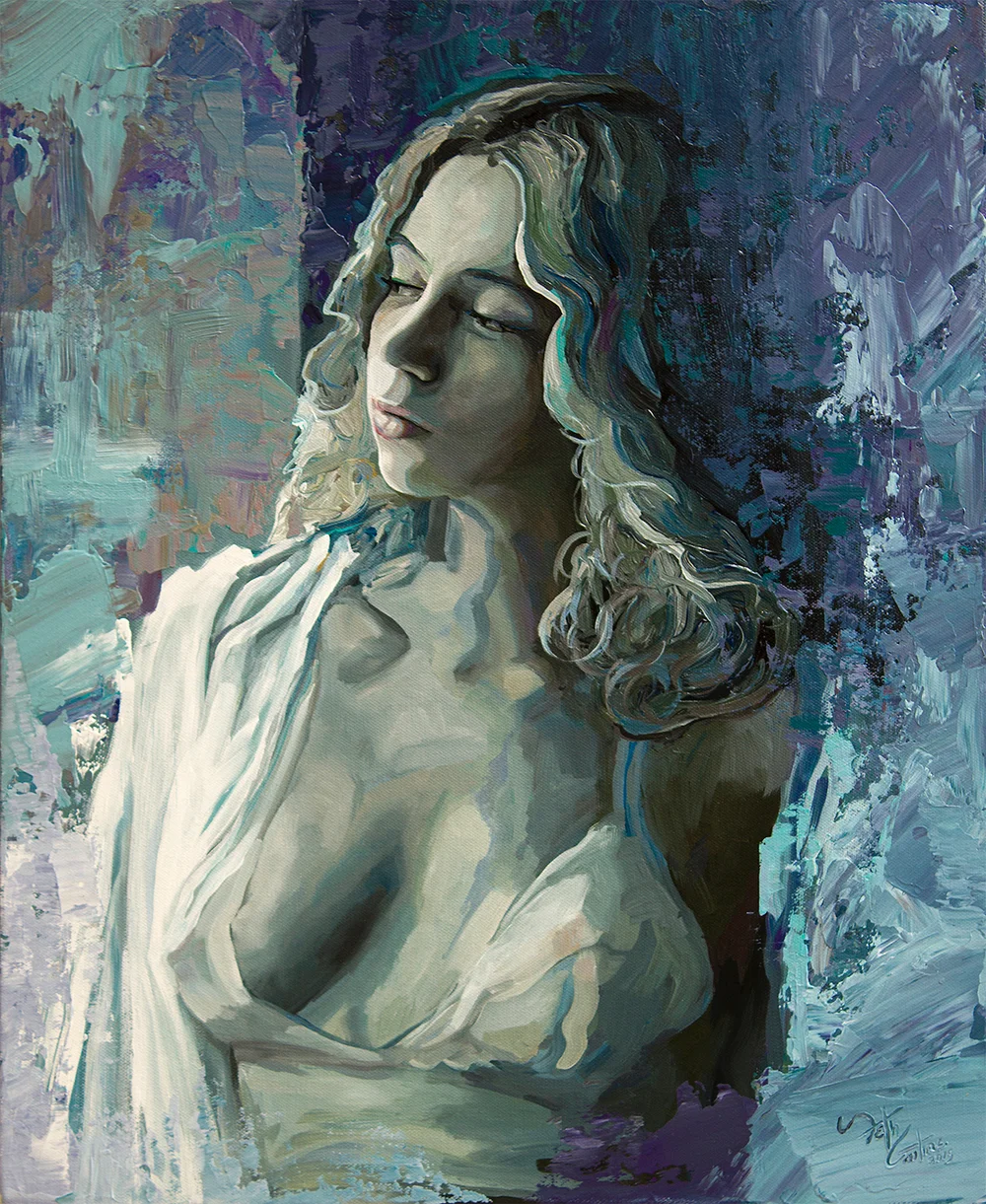 Мои работы это перевод эмоционального состояния человека в визуальную форму с использованием смелых движений, гармонии и прохладных, атмосферных цветов. Я изображаю фигуры и предметы, пойманные в определённое мгновение, чтобы представить вам «снимок спонтанного выражения чувств и эмоций», который рассказывает историю. История, рожденная в моем сердце и разуме, созревает с каждым мазком моей кисти, чтобы полностью выразить мою любовь к работе.Центральной темой большей части моей работы, чаще всего, является, женская фигура, потому что я чувствую, что интенсивная меланхоличная красота лучше всего выражается в женской форме и фигуре. Первичное чувство лучше всего дополняется грацией, гармонией и силой через напряжённые позы, обстановку, выражения лиц и атмосферу