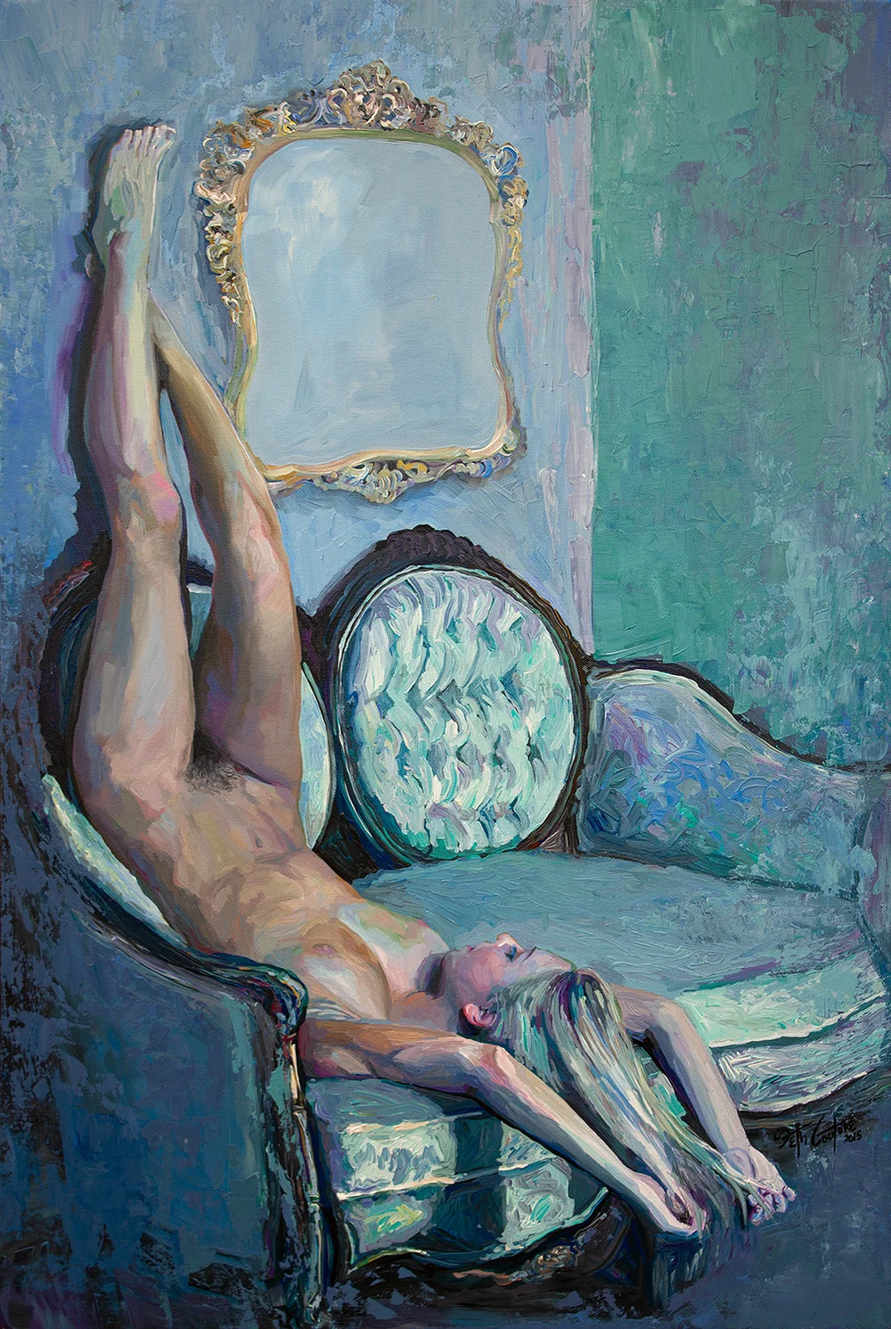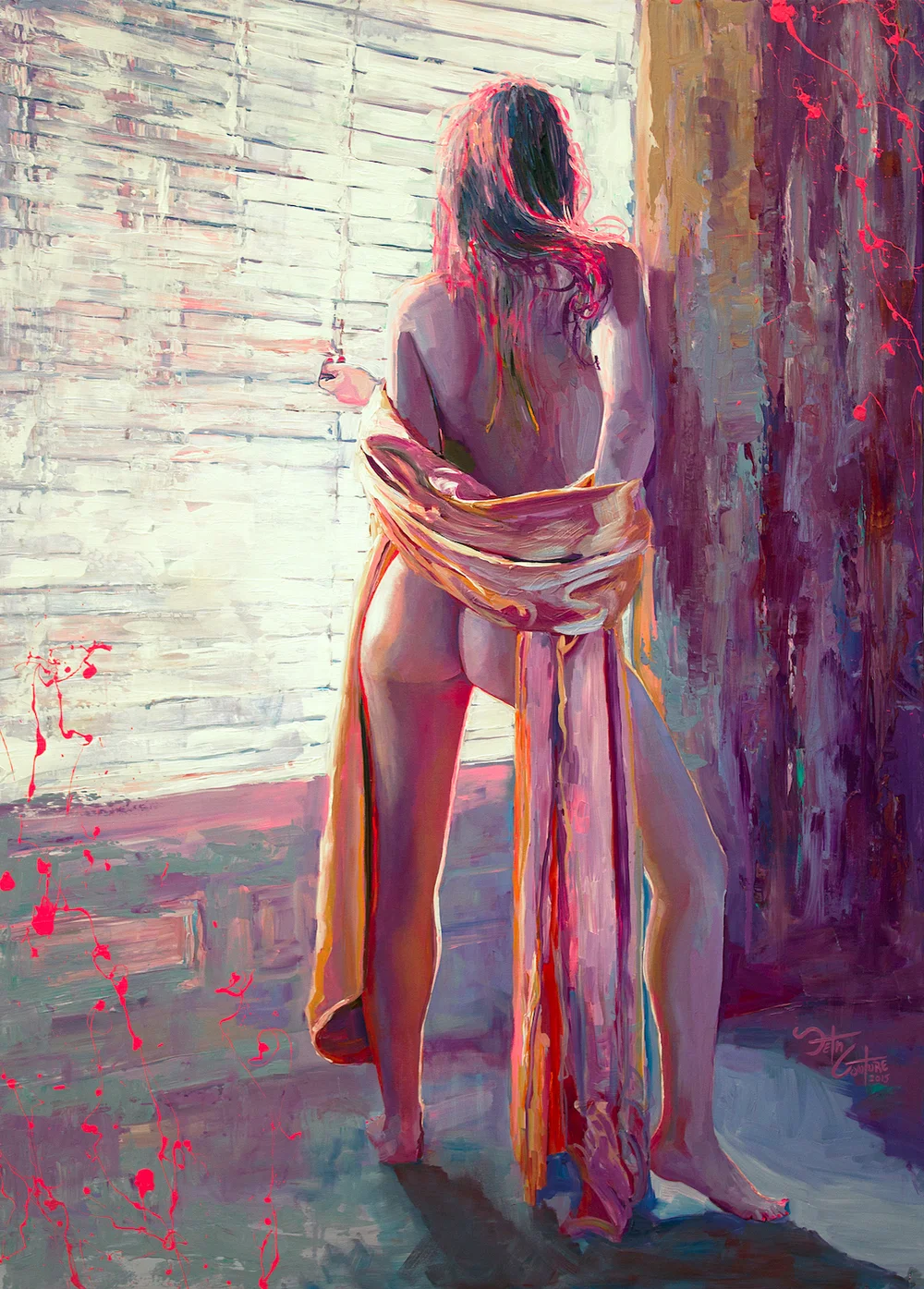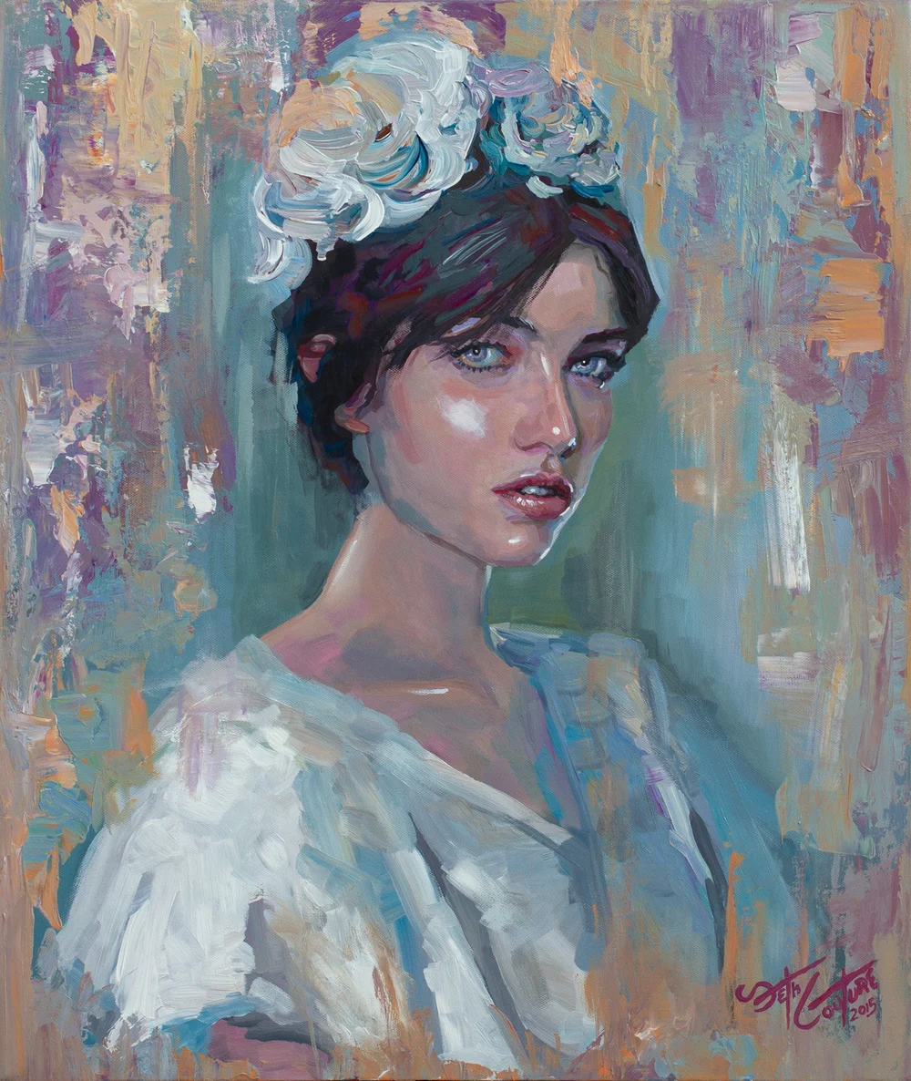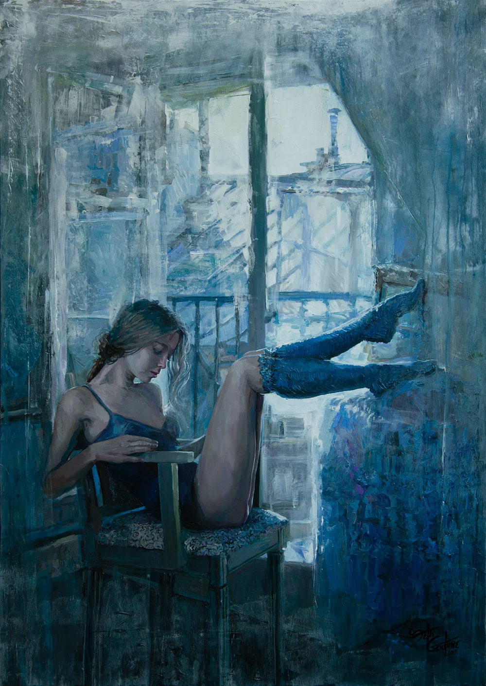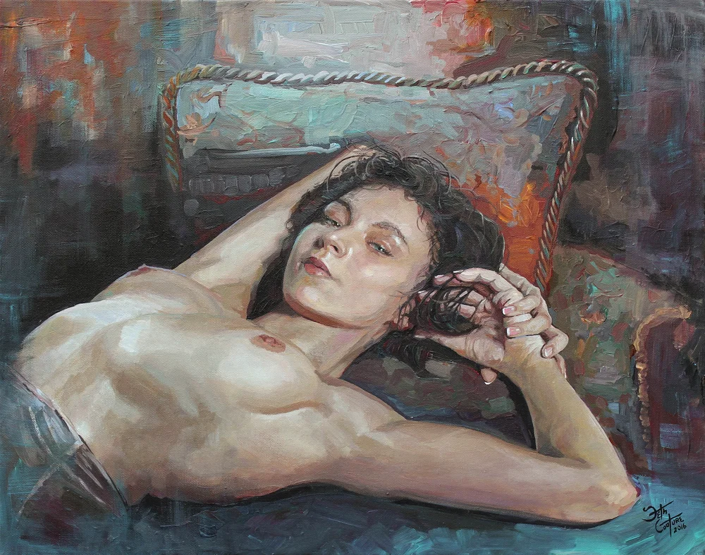 Мои работы это перевод эмоционального состояния человека в визуальную форму с использованием смелых движений, гармонии и прохладных, атмосферных цветов. Я изображаю фигуры и предметы, пойманные в определённое мгновение, чтобы представить вам «снимок спонтанного выражения чувств и эмоций», который рассказывает историю. История, рожденная в моем сердце и разуме, созревает с каждым мазком моей кисти, чтобы полностью выразить мою любовь к работе.Центральной темой большей части моей работы, чаще всего, является, женская фигура, потому что я чувствую, что интенсивная меланхоличная красота лучше всего выражается в женской форме и фигуре. Первичное чувство лучше всего дополняется грацией, гармонией и силой через напряжённые позы, обстановку, выражения лиц и атмосферу